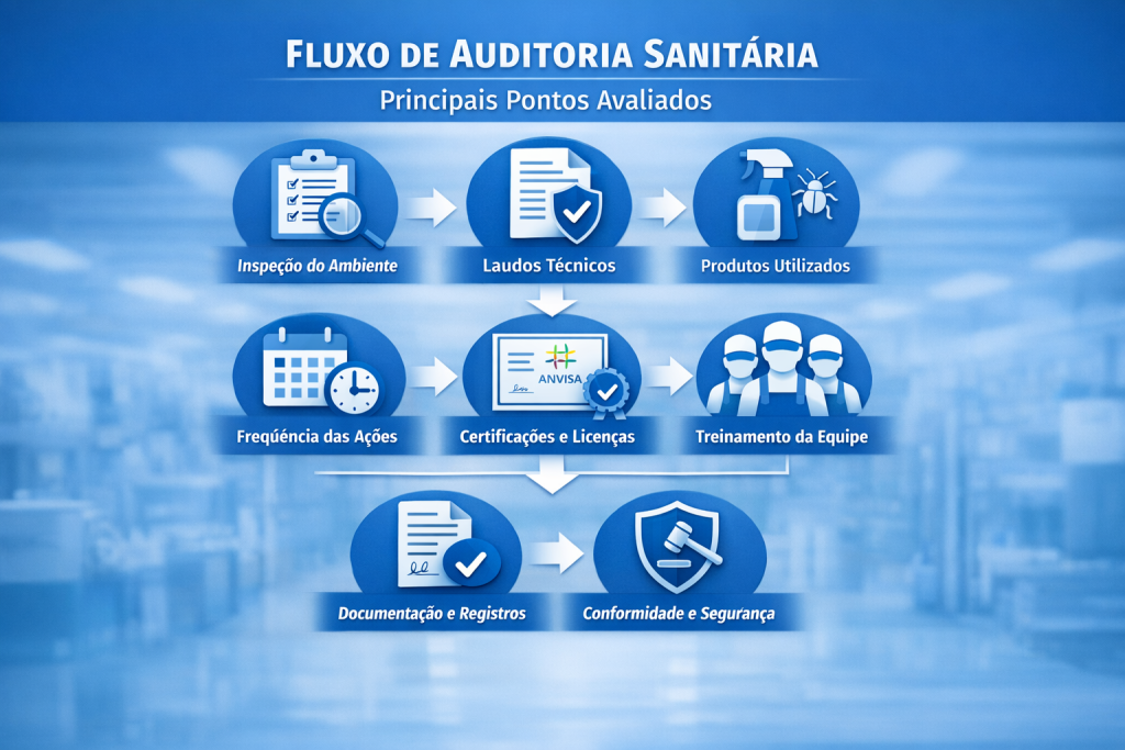 Auditorias sanitárias não avaliam apenas a presença ou ausência de pragas. Elas analisam processos, registros, frequência de monitoramento, produtos utilizados, capacitação da equipe técnica e emissão de laudos. Ou seja, o foco está no sistema de controle, não apenas no resultado pontual.